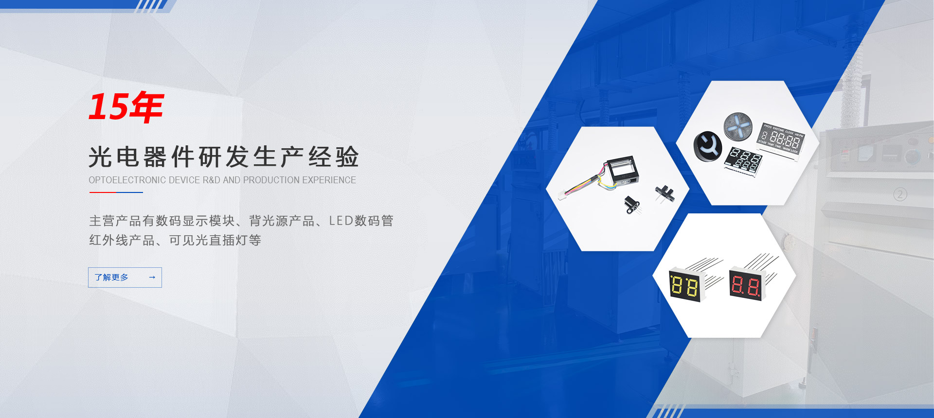 主營產品有數碼顯示模塊、背光源產品、LED數碼管、紅外線產品、可見光直插燈等,主要用于日常生活電器:冰箱、空調、洗衣機;交通工具:汽車、動車、飛機;工業設備、儀器儀表等廣范領域。